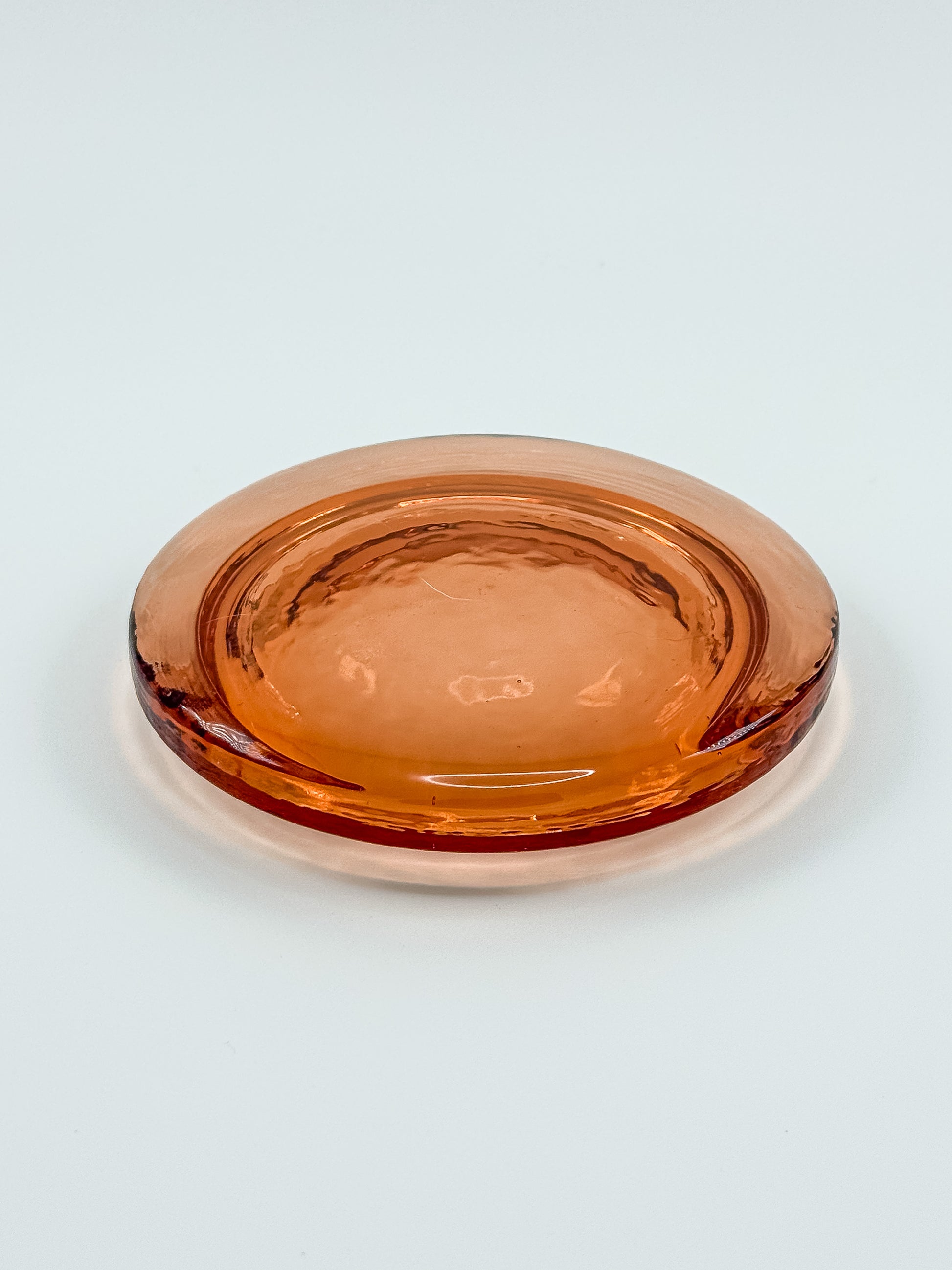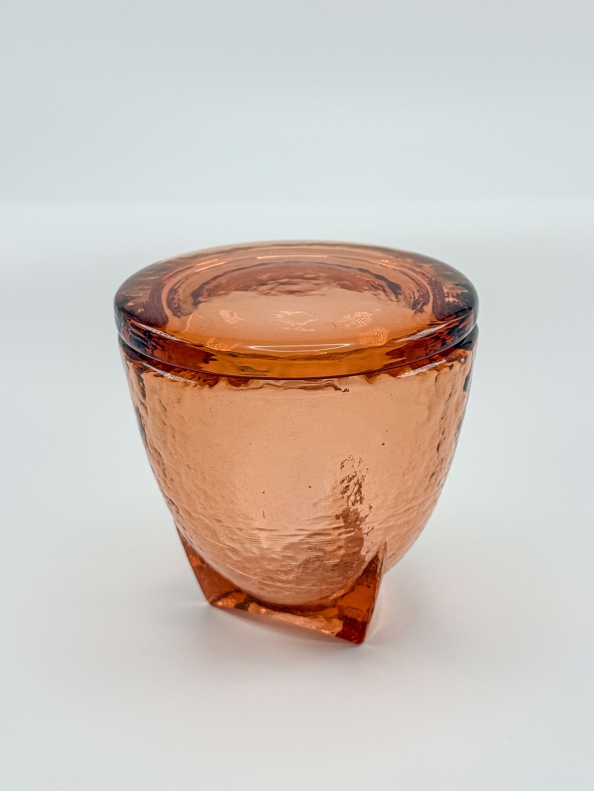 A luminous handcrafted jar by Fire & Light, created from recycled glass in a warm copper hue. The pedestal base and rounded lid showcase the brand’s signature combination of artistry and sustainability—each piece individually poured and finished in Northern California. The rich color glows beautifully in natural light, highlighting subtle bubbles and texture unique to recycled glass. Perfect for holding small treasures, candy, or simply admired as a sculptural accent on a shelf or table.