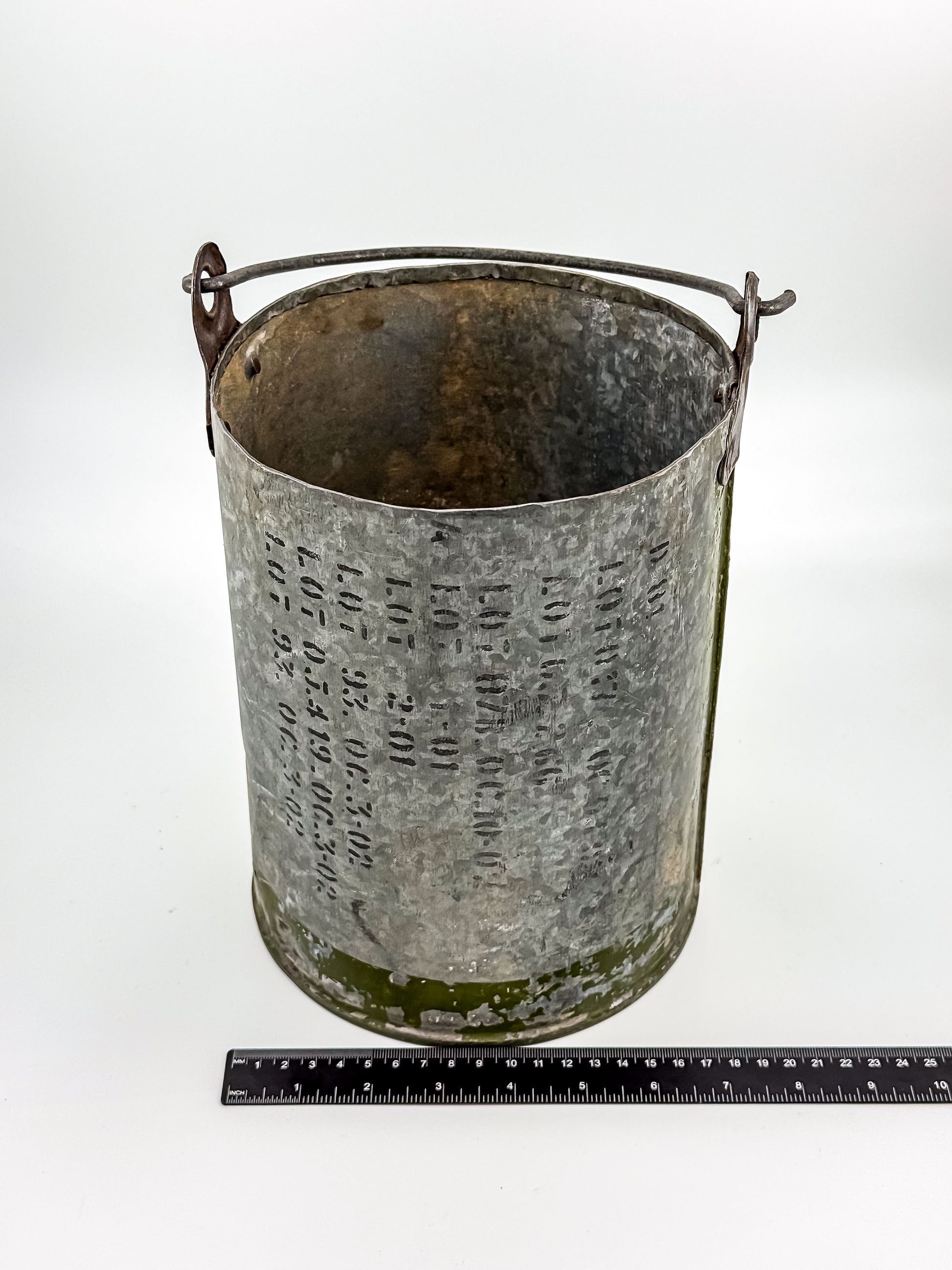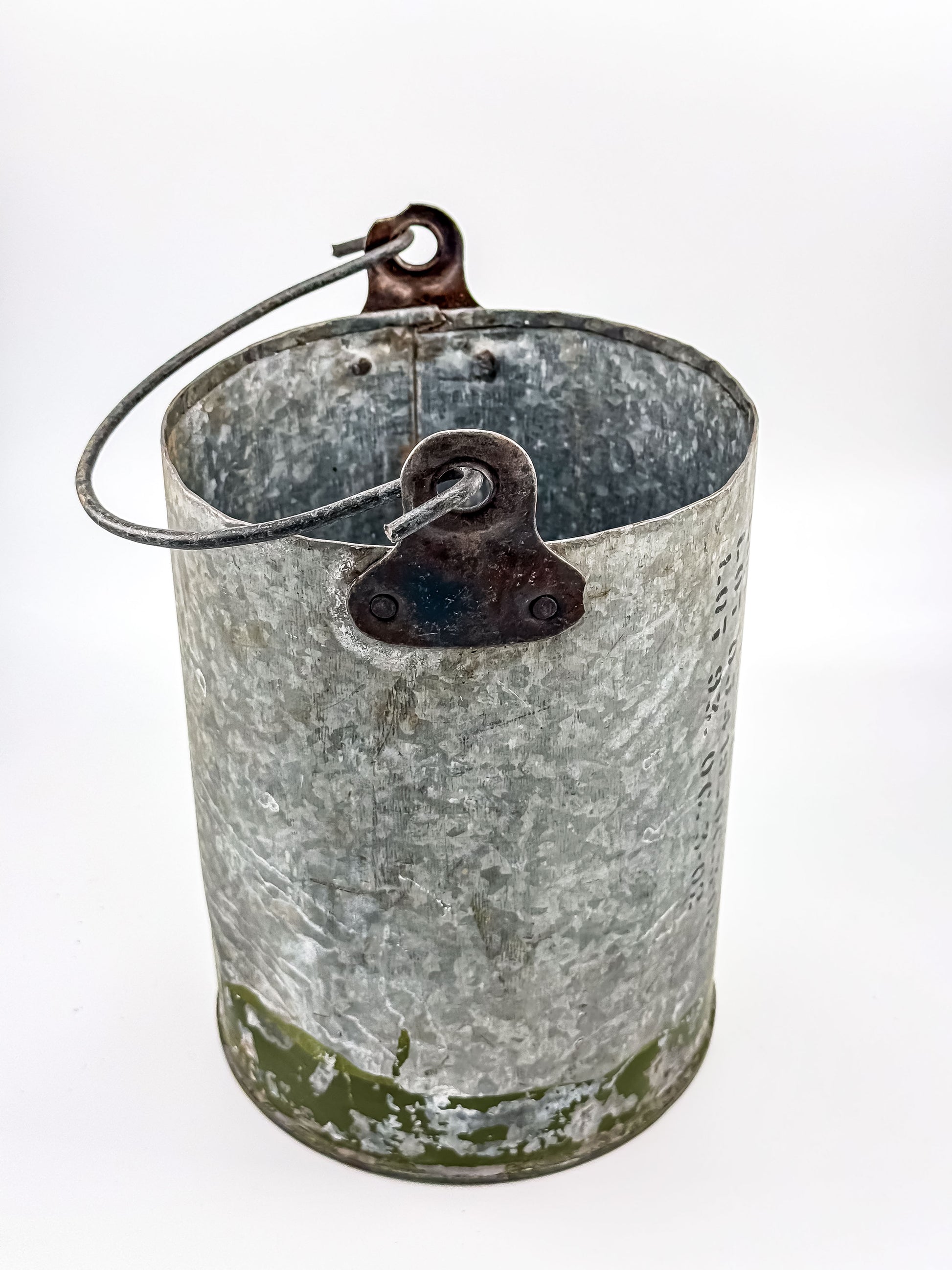 Made from an artillery shell, this vintage metal canister has a rugged, industrial presence, originally made for heavy-duty military or utility use. The surface shows layers of original green paint, stenciled markings, and worn galvanized metal — all of which have developed a deep, authentic patina over time. The riveted handle brackets and wire swing handle add to its utilitarian charm.